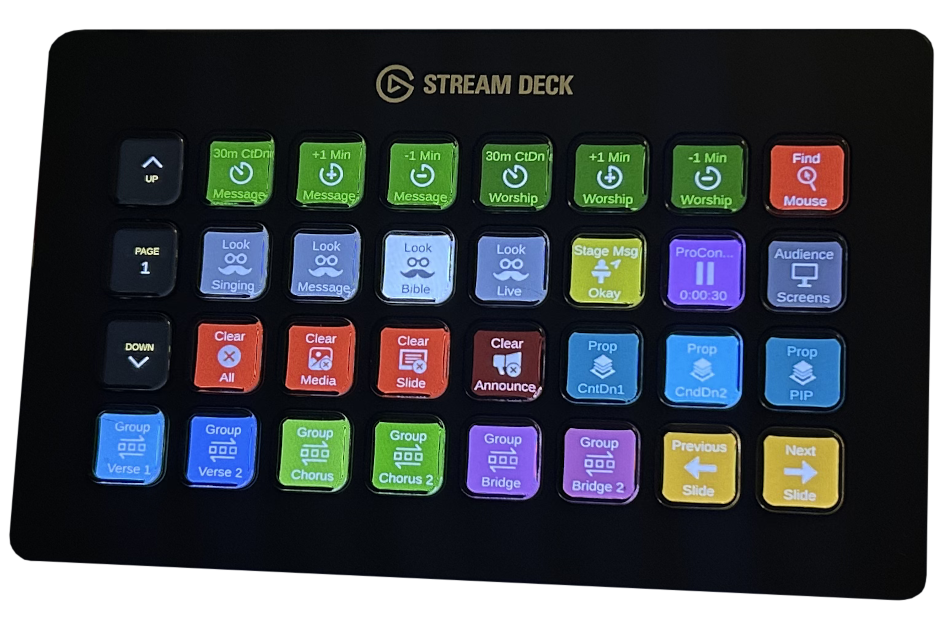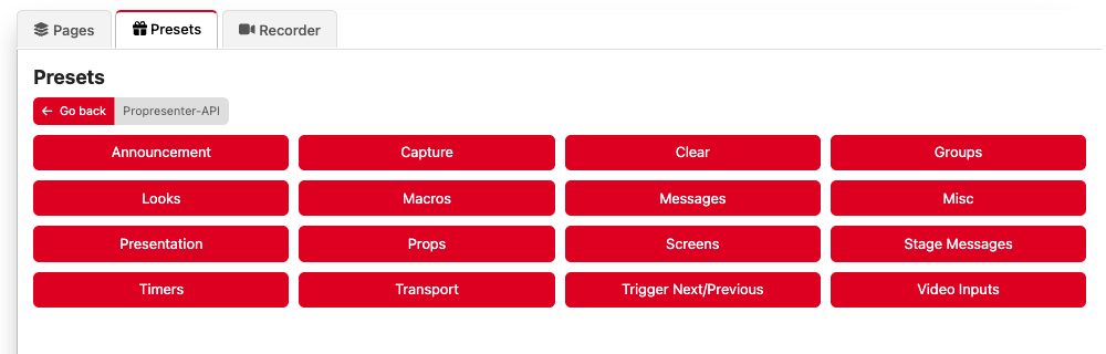 For example, the "Groups" presets are dynamically created for all of the groups you have defined in your ProPresenter settings - just drag these onto a page to create buttons that trigger the first slide in these groups: