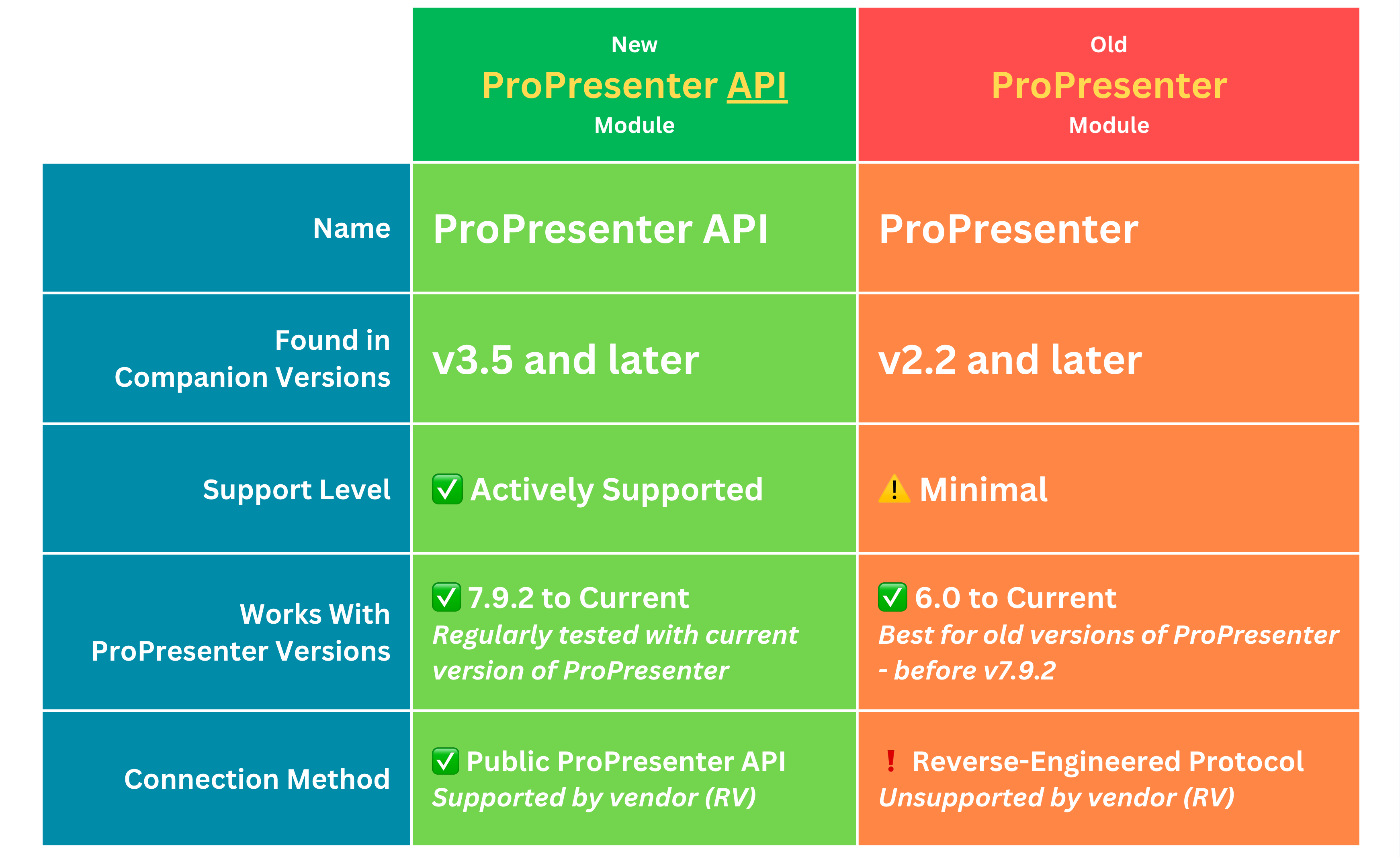 Also, please note that the old module does have a few actions that are not (yet) supported in the official ProPresenter API and if you use those actions, you will want to keep using the old module alongside the new module.