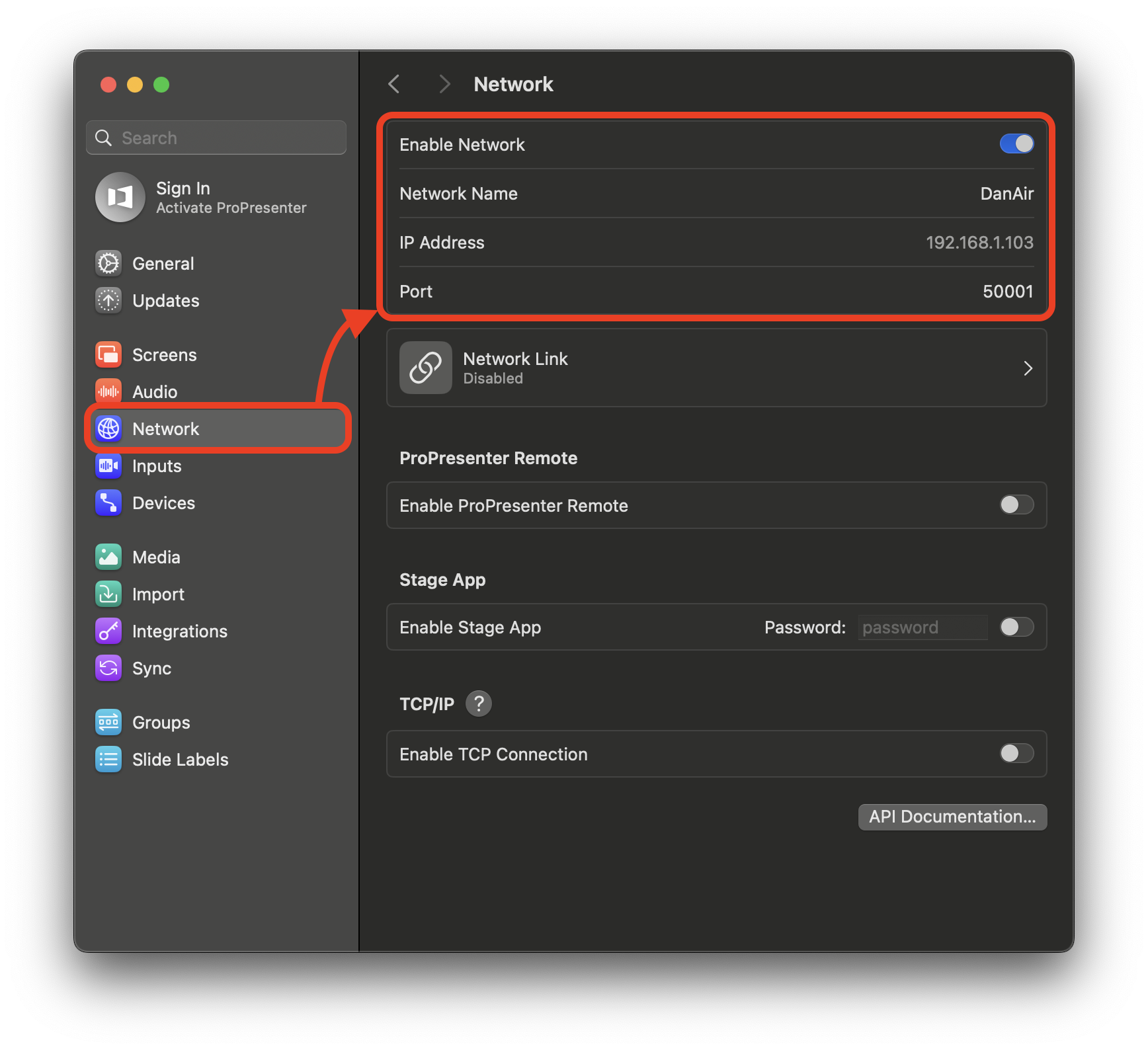 Both the IP Address and ProPresenter port are shown in the network settings of ProPresenter.