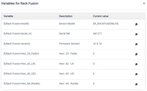 So as an example, here is a picture of the variables that are created when a Rack Fusion Live is connected to Companion via this module: